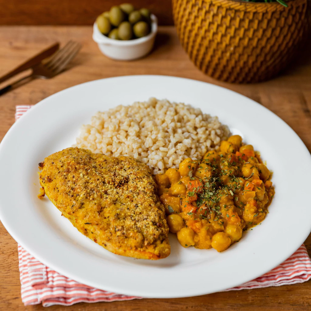 Filé de frango com crosta de grãos integrais + arroz cateto integral + dahl indiano de grão de bico